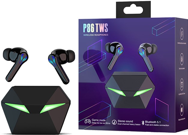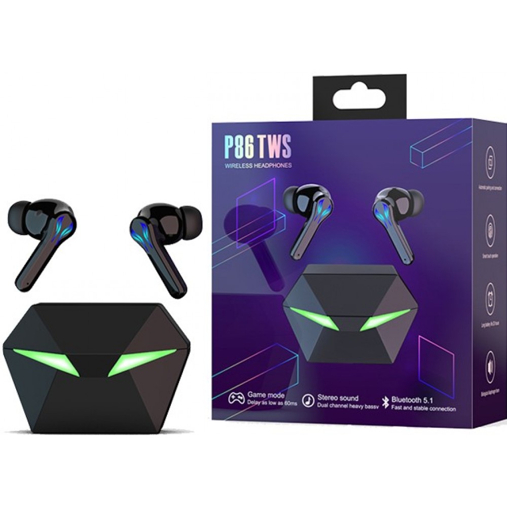 Die TWS P86 Bluetooth Kopfhörer wurden speziell für Mobile Gamer entwickelt. Die Kopfhörer haben ein einzigartiges und futuristisches Design, welches nicht von dieser Erde zu stammen scheint. Das Ladeetui verfügt über zwei gross LED Augen, welche grün leuchten wenn das Etui geöffnet wird. Als würde das Etui leben und dich mit einem ausserirdischen und mysteriösem Blick anschauen.