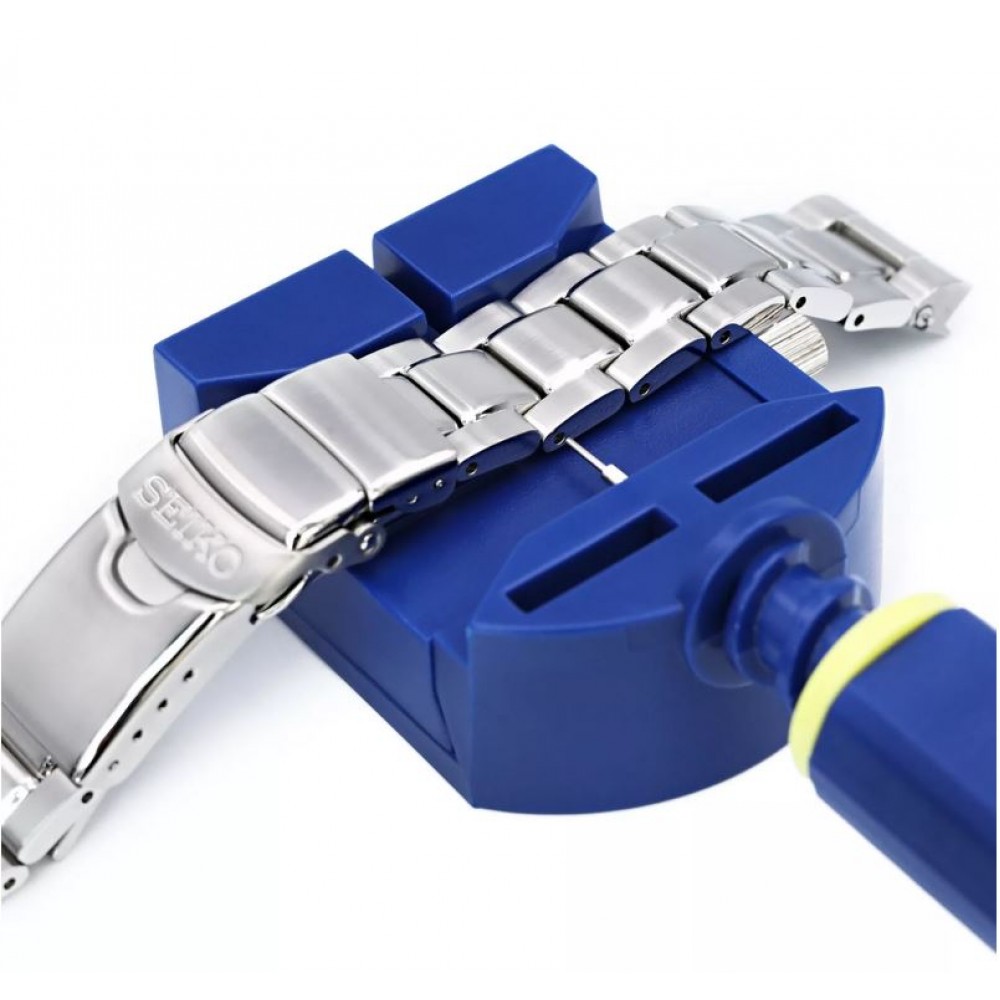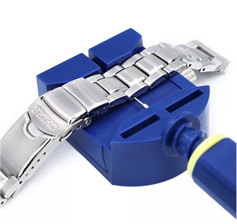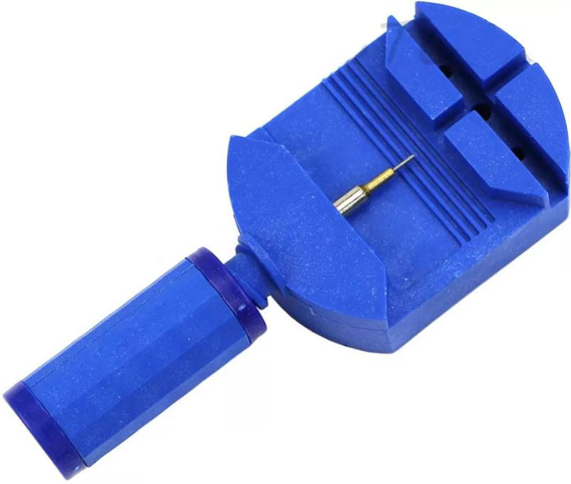 Werkzeug zum einfacheren Anpassen und Einstellen von Armbanduhren, bei welchen das Armband aus einzelnen Gliedern besteht. Durch das Wekzeug lässt sich das Armband einfach an der richtigen Stelle fixieren, sodass die Haltestifte aus den Gliedern entfernt bzw. eingesetzt werden können. Dadurch kann ein solches Armband mit den entsprechenden Teilen verlängert bzw. verkürzt werden.