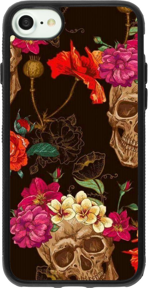 Coque iPhone 7 / 8 / SE (2020, 2022) - Silicone rigide noir Skulls and flowers
