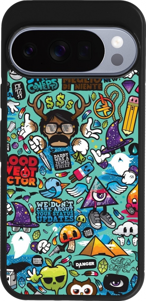 Coque Google Pixel 10 / Pixel 10 Pro - Silicone rigide noir Mixed Cartoons Turquoise