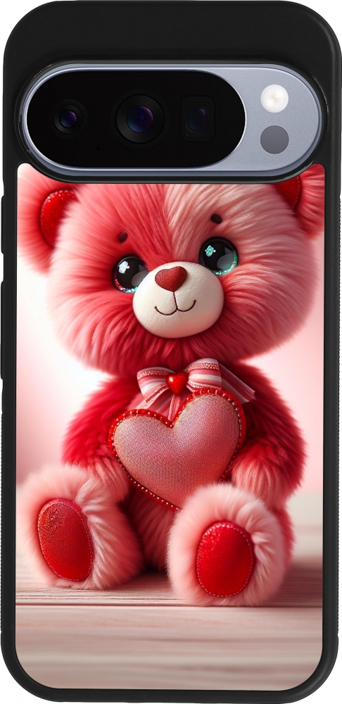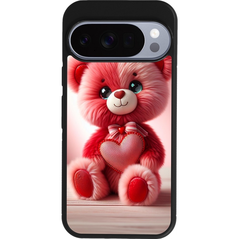 Coque Google Pixel 10 / Pixel 10 Pro - Silicone rigide noir Valentine 2024 Ourson rose