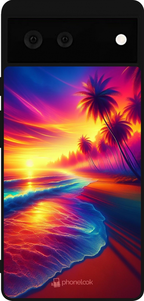 Coque Google Pixel 6 - Silicone rigide noir Plage coucher soleil flashy