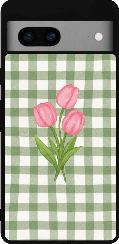 Coque Google Pixel 7a - Silicone rigide noir Green vichy tulips Spring 2026