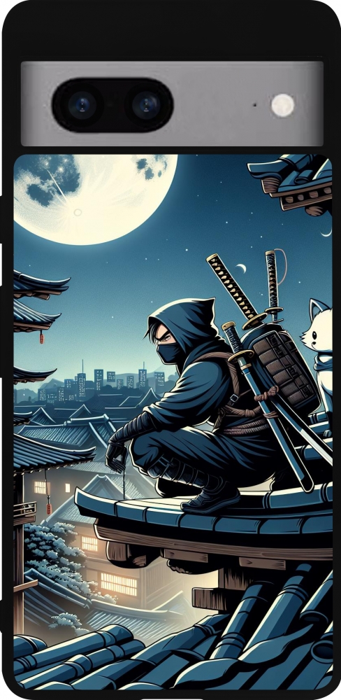 Coque Google Pixel 7a - Silicone rigide noir Ninja sous la lune