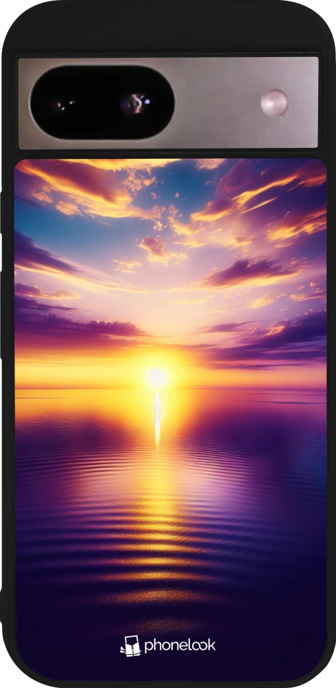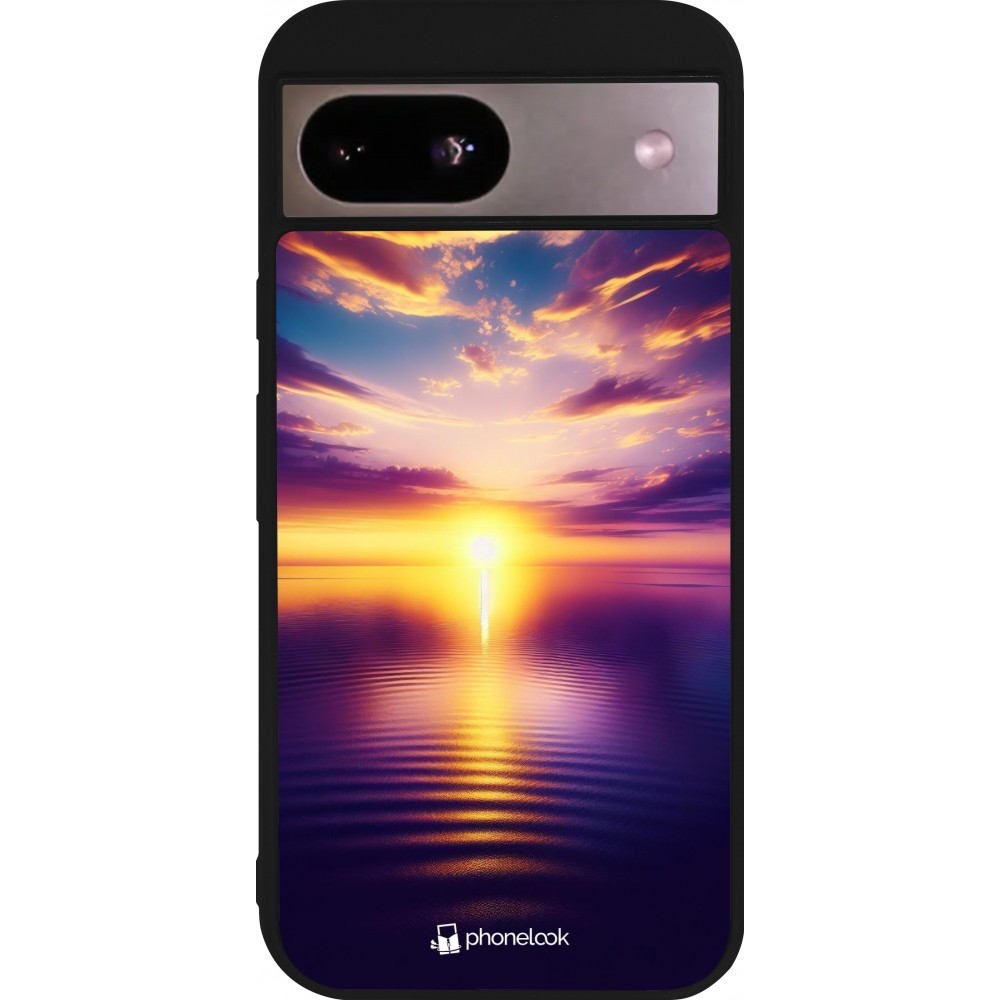 Coque Google Pixel 8a - Silicone rigide noir Coucher soleil jaune violet