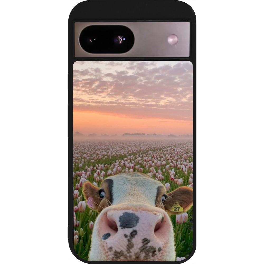 Coque Google Pixel 8a - Silicone rigide noir Cow with tulips Spring 2026