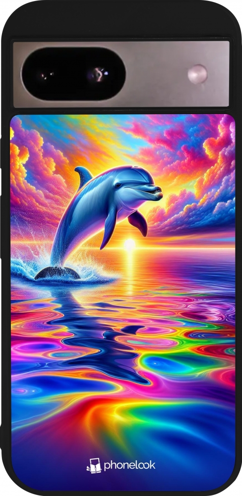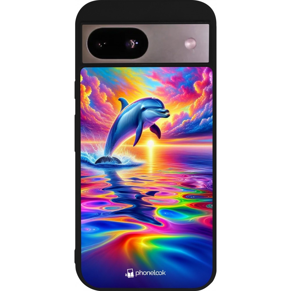 Coque Google Pixel 8a - Silicone rigide noir Dauphin arc-en-ciel heureux