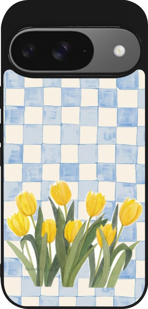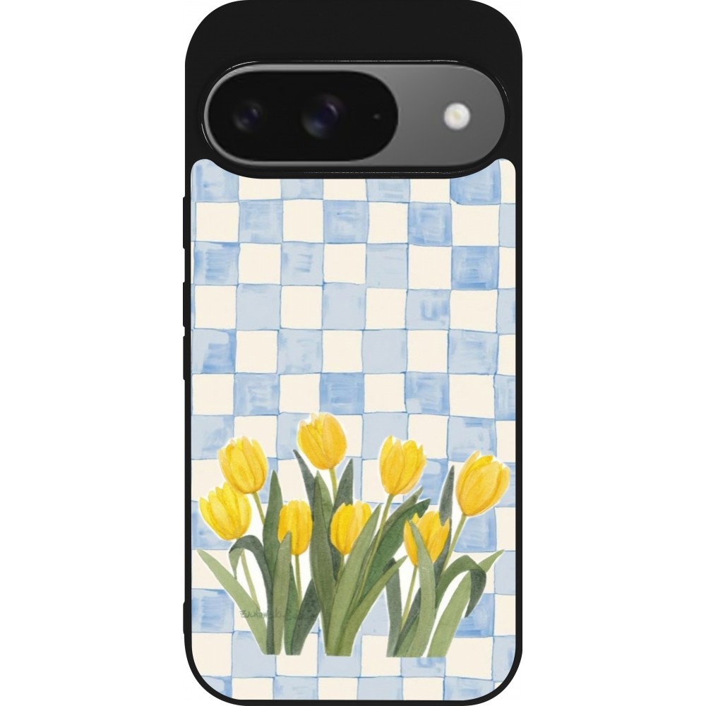 Coque Google Pixel 9 / Pixel 9 Pro - Silicone rigide noir Blue vichy tulips 2026