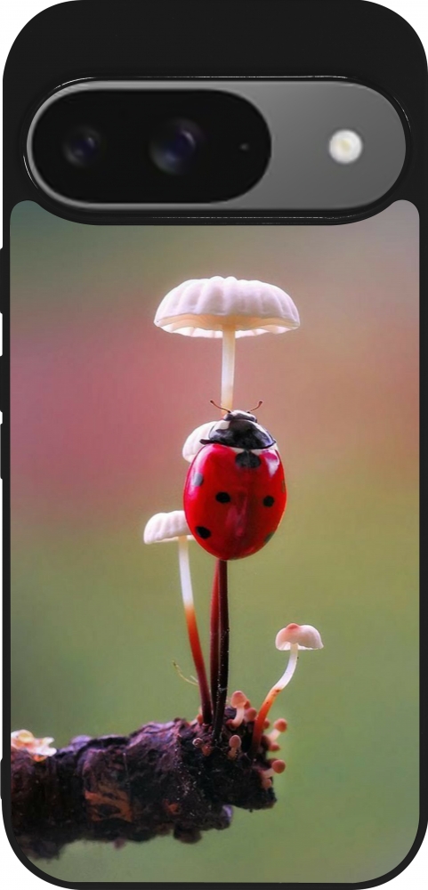 Coque Google Pixel 9 / Pixel 9 Pro - Silicone rigide noir Ladybird on a mushroom Spring 2026