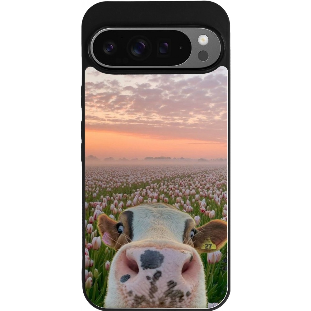 Coque Google Pixel 9 Pro XL - Silicone rigide noir Cow with tulips Spring 2026