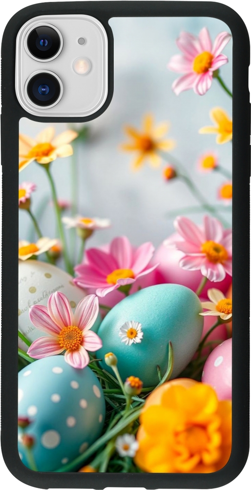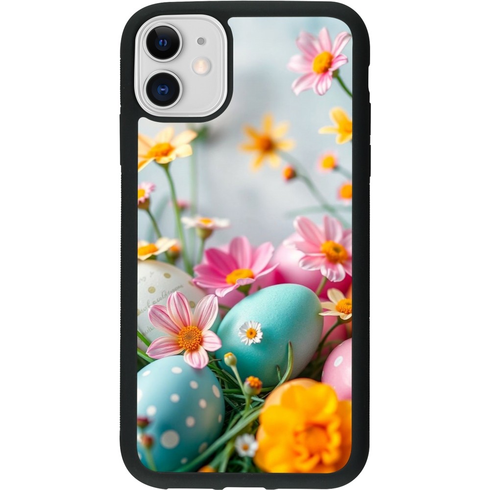 Coque iPhone 11 - Silicone rigide noir Easter 2026 Eggs with flowers