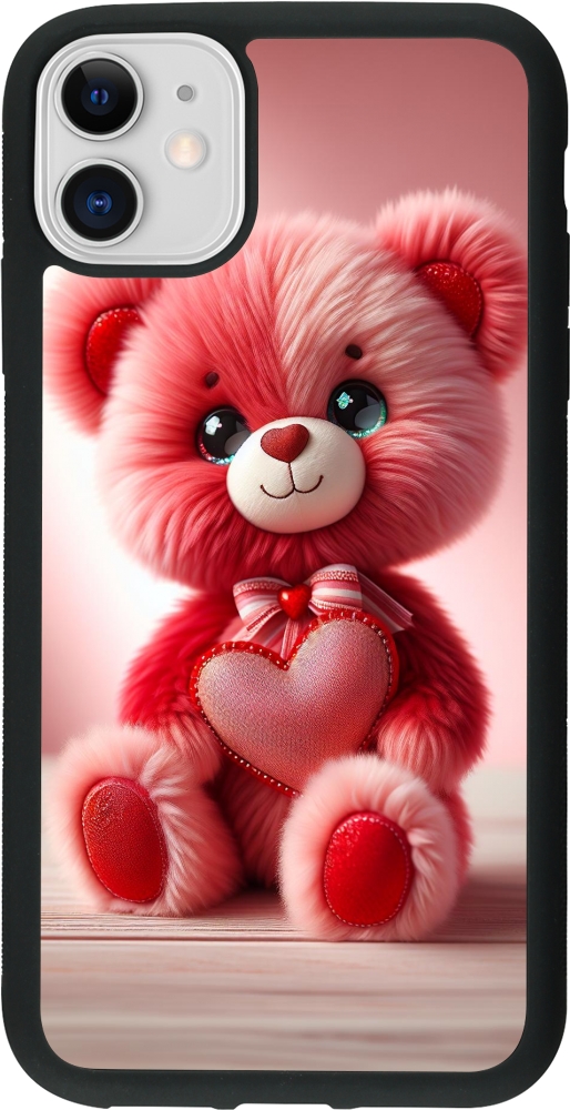 Coque iPhone 11 - Silicone rigide noir Valentine 2024 Ourson rose