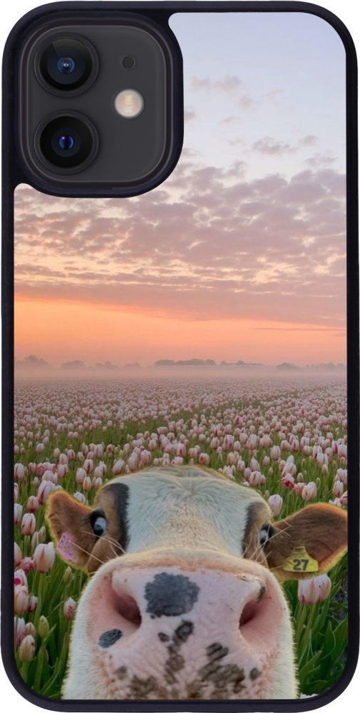 Coque iPhone 12 mini - Silicone rigide noir Cow with tulips 2026