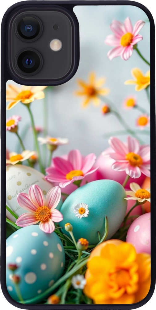 Coque iPhone 12 mini - Silicone rigide noir Easter 2026 Eggs with flowers