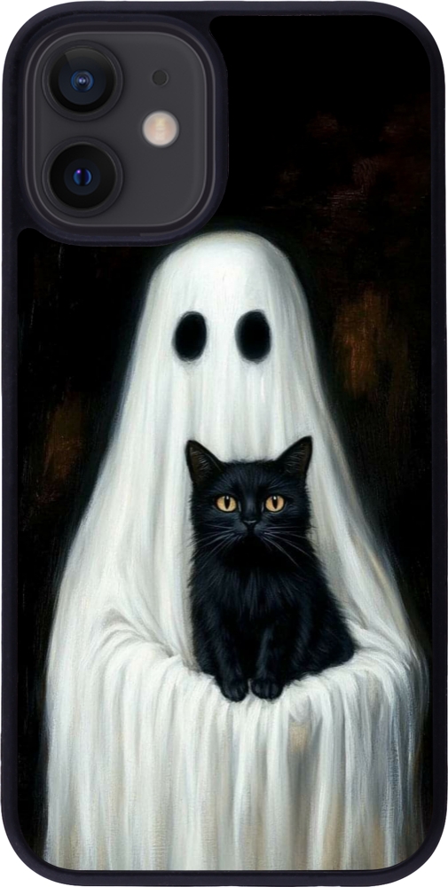 Coque iPhone 12 mini - Silicone rigide noir Halloween 2025 Ghost with black cat