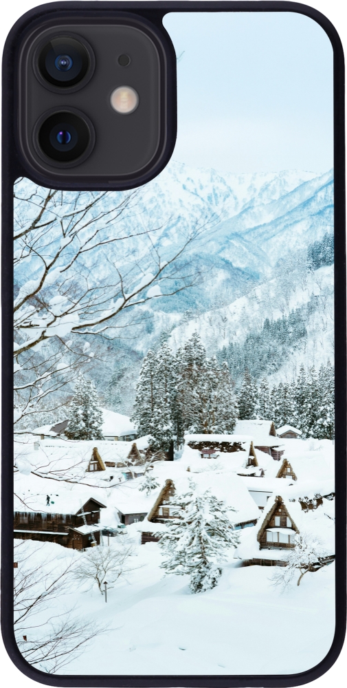 Coque iPhone 12 mini - Silicone rigide noir Winter 25 Winter snowy landscape