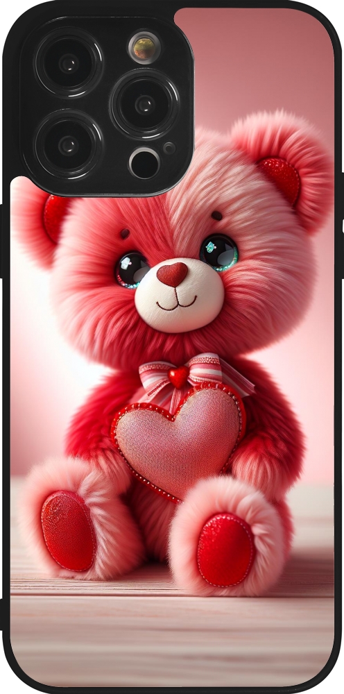 Coque iPhone 14 Pro Max - Silicone rigide noir Valentine 2024 Ourson rose