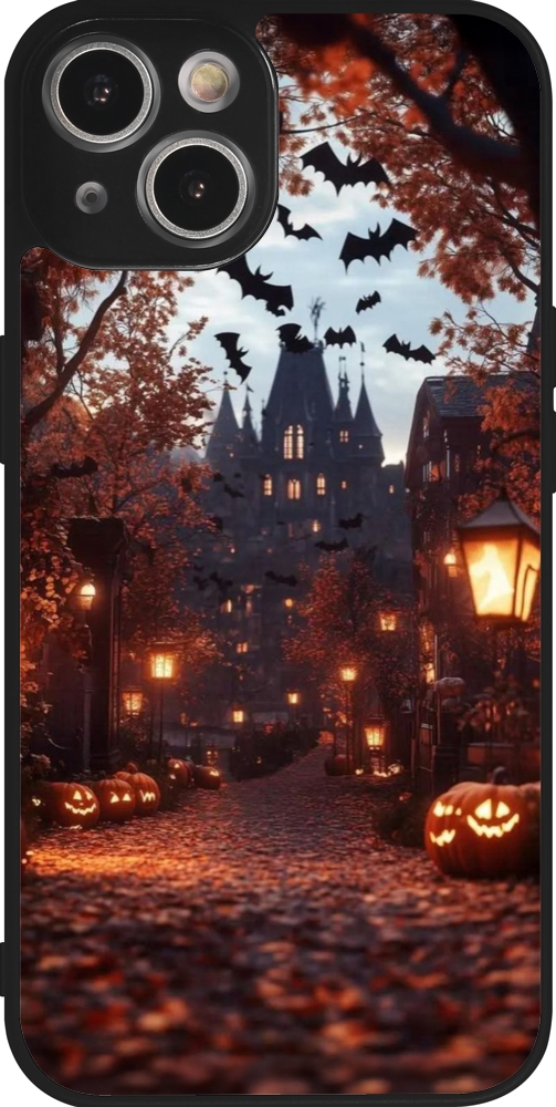 Coque iPhone 14 - Silicone rigide noir Halloween 2025 Haunted house