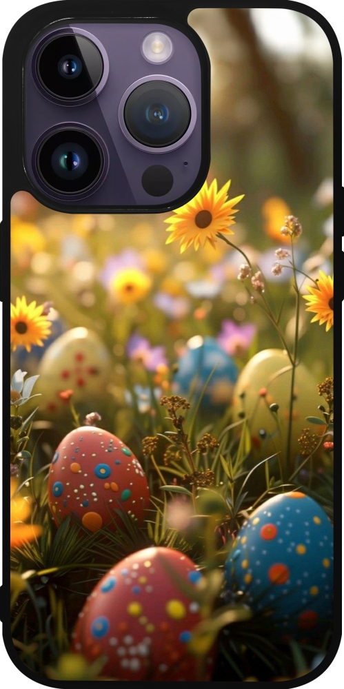 Coque iPhone 15 Pro - Silicone rigide noir Easter 2026 Decorated eggs