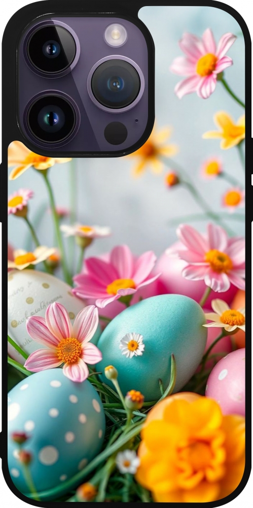 Coque iPhone 15 Pro - Silicone rigide noir Easter 2026 Eggs with flowers