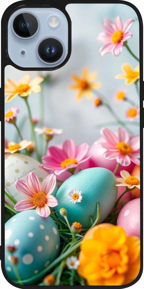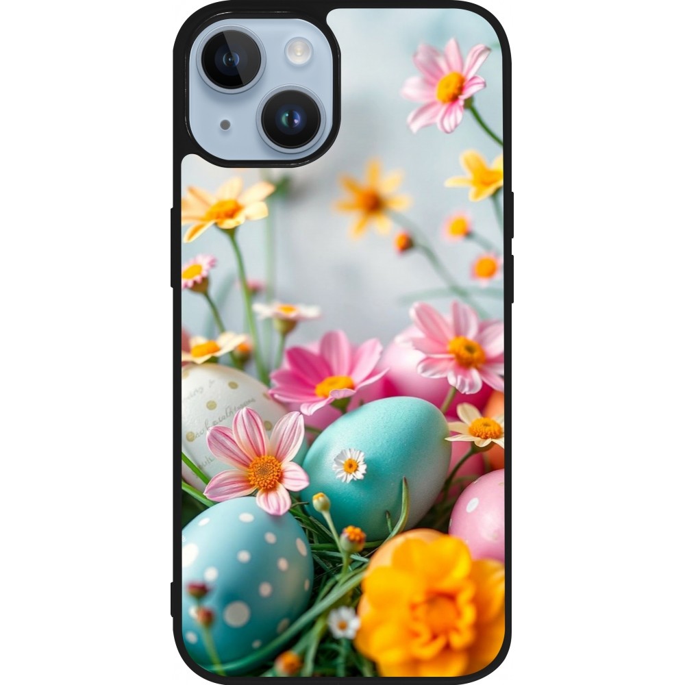 Coque iPhone 15 - Silicone rigide noir Easter 2026 Eggs with flowers