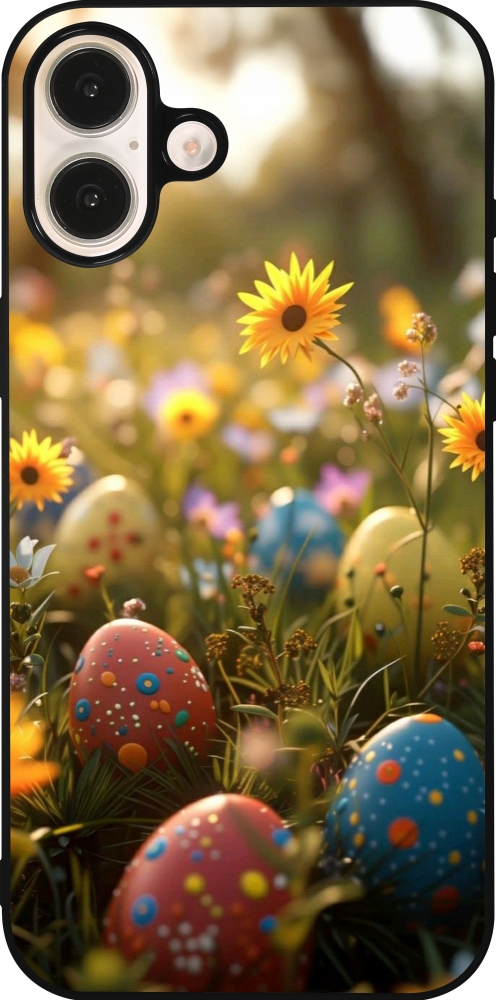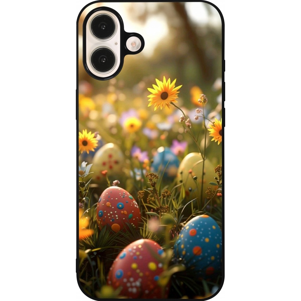 Coque iPhone 16 Plus - Silicone rigide noir Easter 2026 Decorated eggs