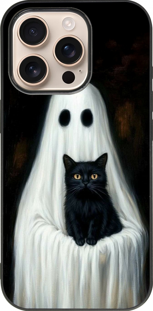 Coque iPhone 16 Pro - Silicone rigide noir Halloween 2025 Ghost with black cat