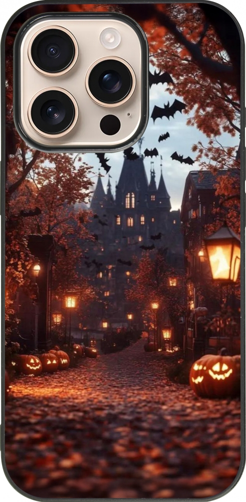 Coque iPhone 16 Pro - Silicone rigide noir Halloween 2025 Haunted house
