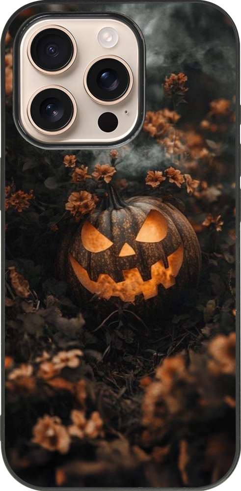 Coque iPhone 16 Pro - Silicone rigide noir Halloween 2025 Pumpkin with flowers
