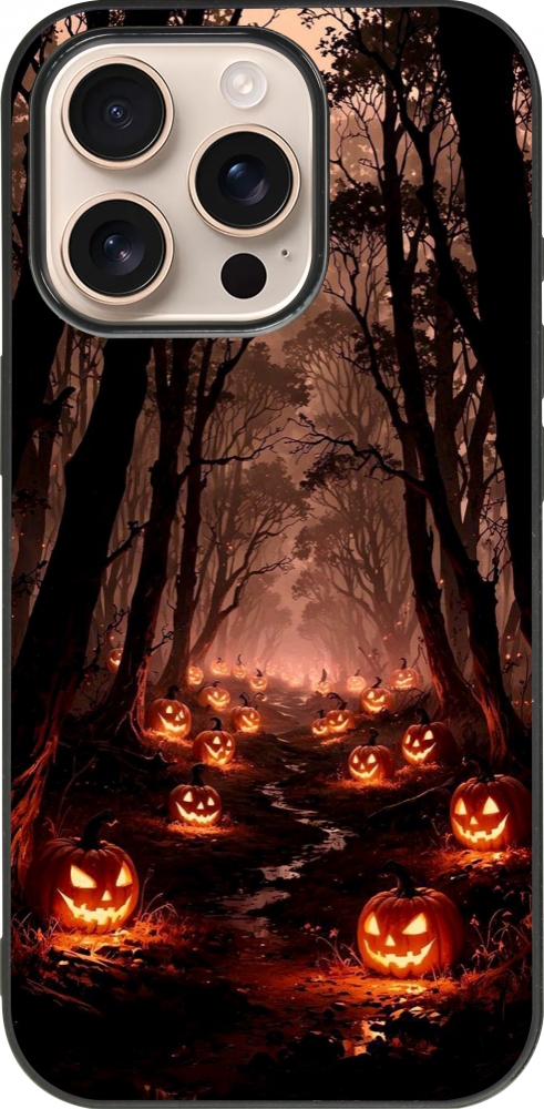 Coque iPhone 16 Pro - Silicone rigide noir Halloween 2025 Road of Terrifying Pumpkins