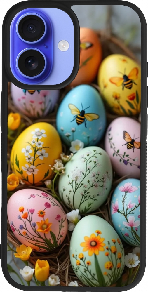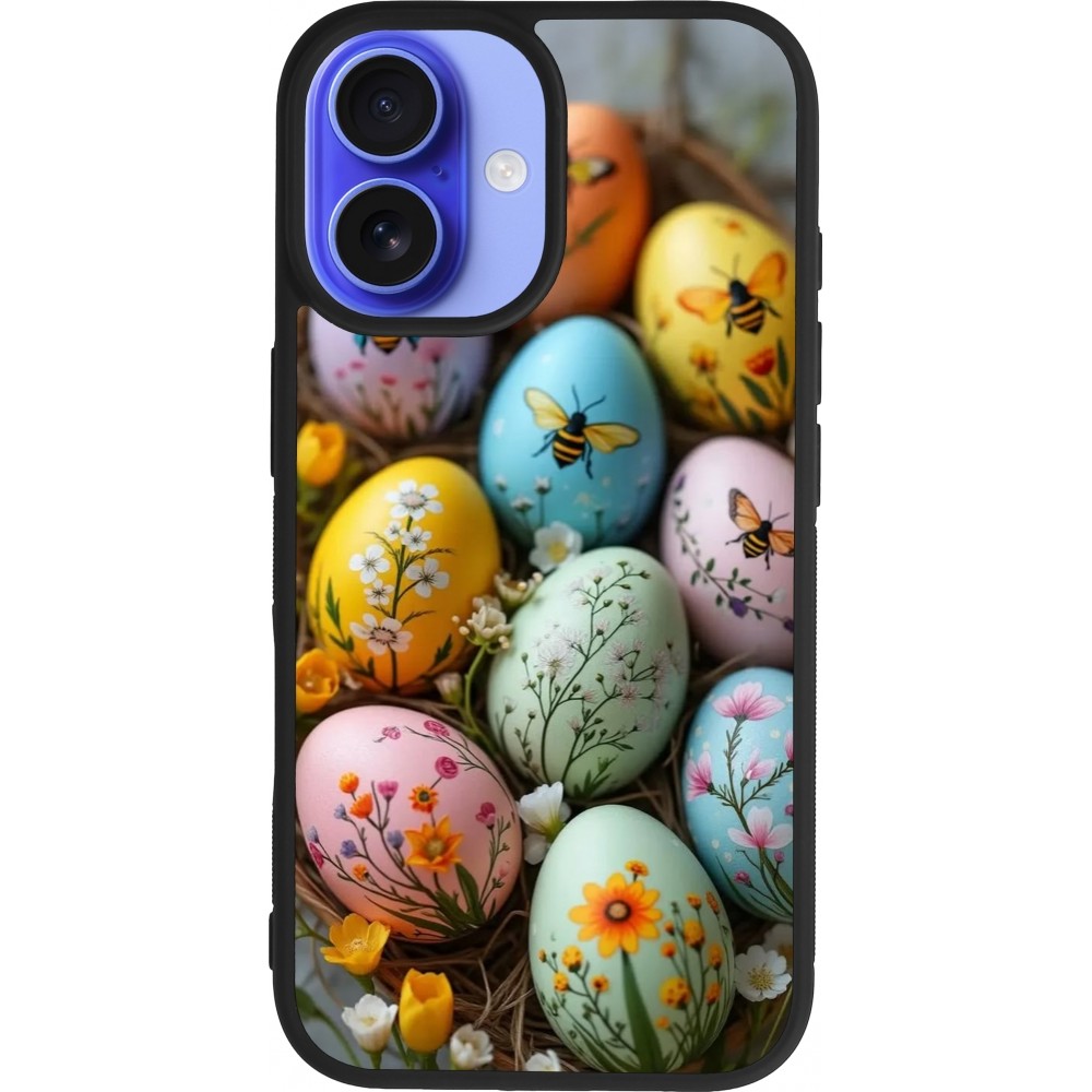 Coque iPhone 16 - Silicone rigide noir Easter 2026 Eggs with bees