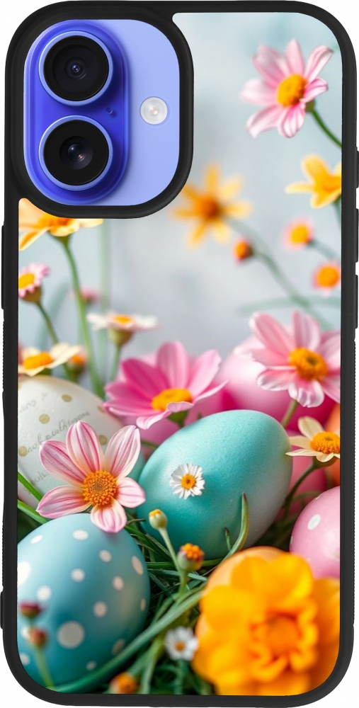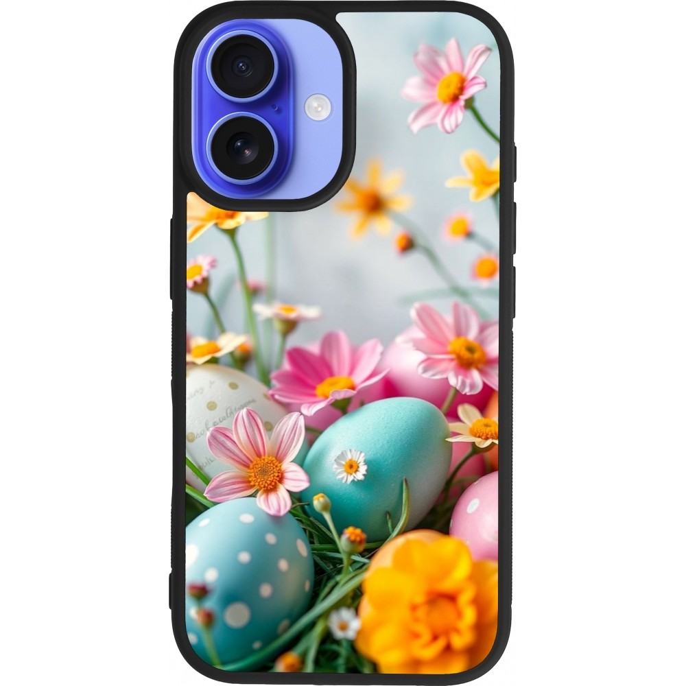 Coque iPhone 16 - Silicone rigide noir Easter 2026 Eggs with flowers