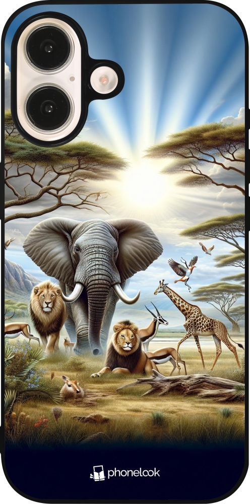 Coque iPhone 16 - Silicone rigide noir Vie sauvage africaine
