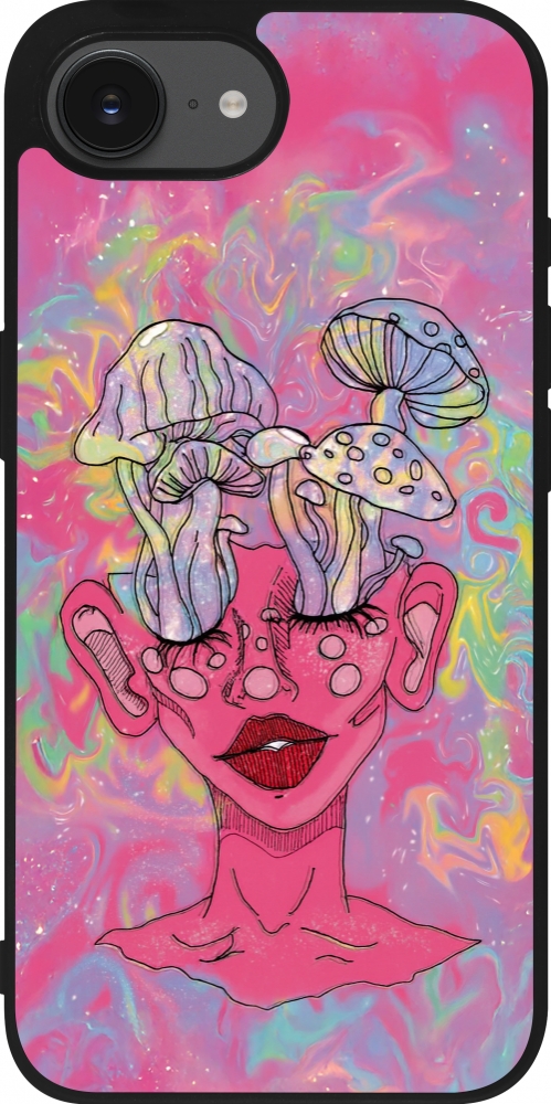 Coque iPhone 17e / 16e - Silicone rigide noir Psychedelic pink mushroom