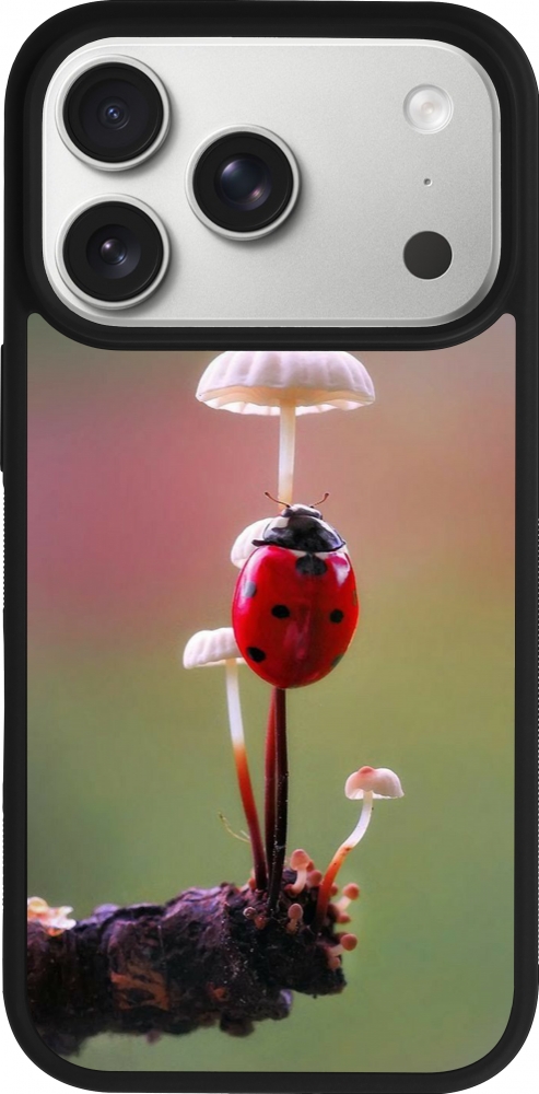 Coque iPhone 17 Pro - Silicone rigide noir Ladybird on a mushroom Spring 2026