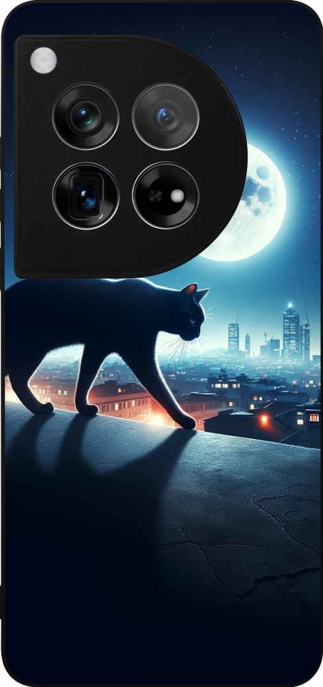 Coque OnePlus 12 - Silicone rigide noir Chat noir sous la pleine lune