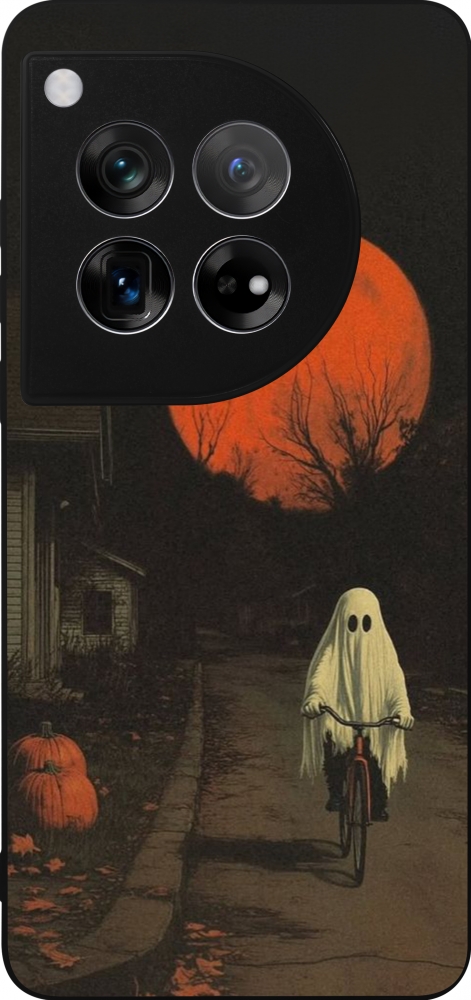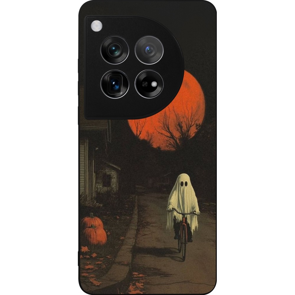 Coque OnePlus 12 - Silicone rigide noir Halloween 2025 Ghost on a bicycle