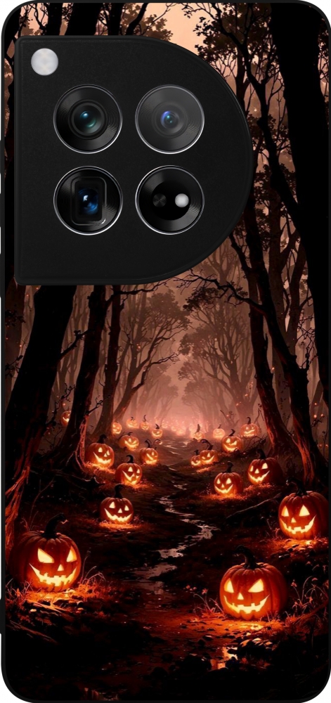 Coque OnePlus 12 - Silicone rigide noir Halloween 2025 Road of Terrifying Pumpkins