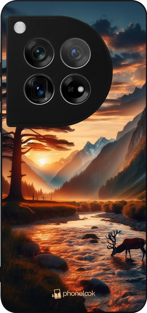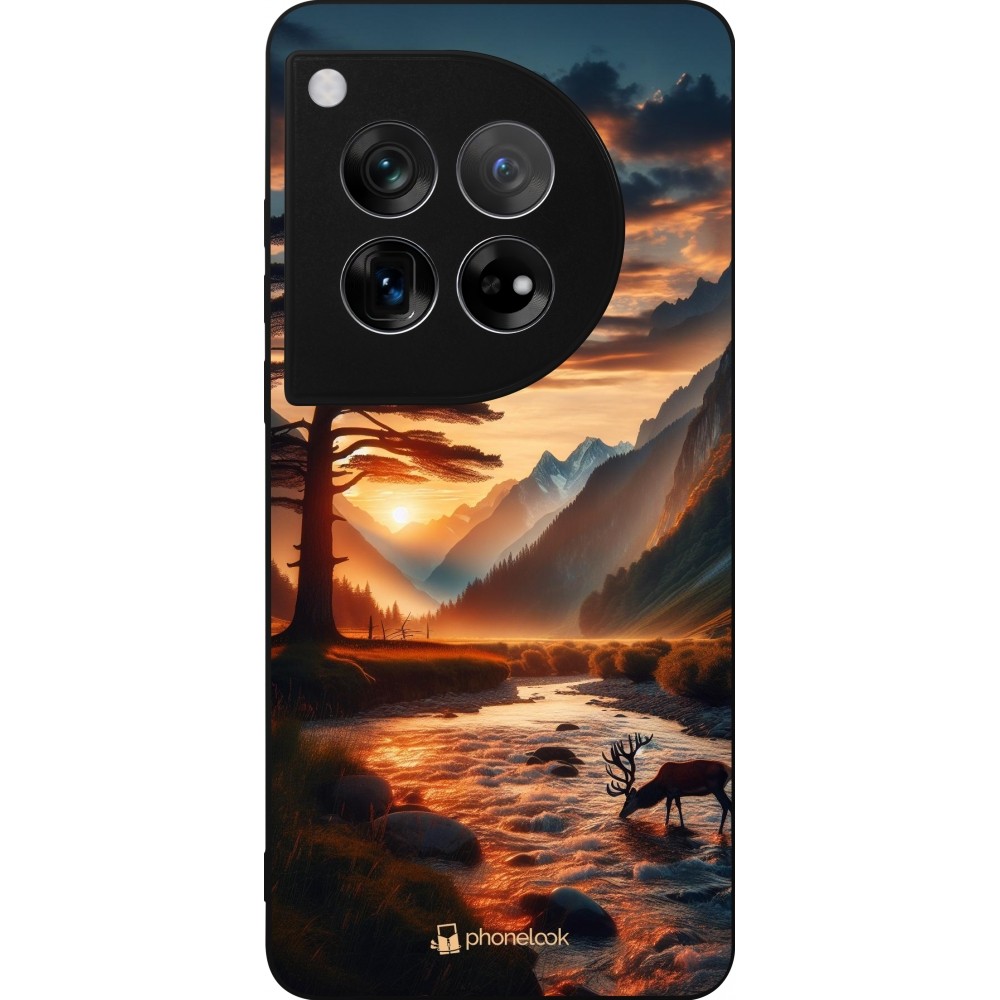 Coque OnePlus 12 - Silicone rigide noir Valley Sunset Deer Tree