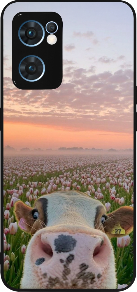 Coque OPPO Reno7 5G - Silicone rigide noir Cow with tulips Spring 2026