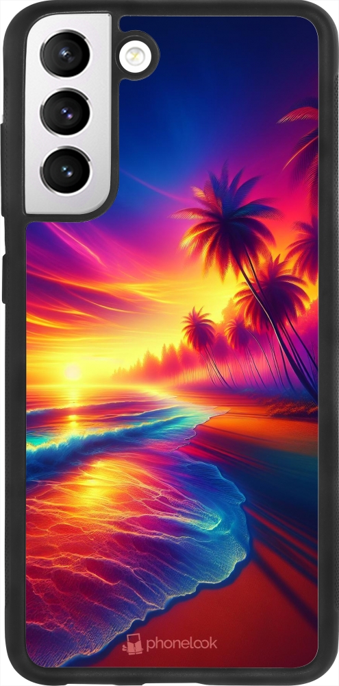 Coque Samsung Galaxy S21 FE 5G - Silicone rigide noir Plage coucher soleil flashy