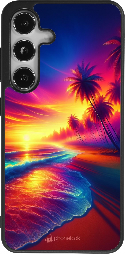 Coque Samsung Galaxy S25 - Silicone rigide noir Plage coucher soleil flashy